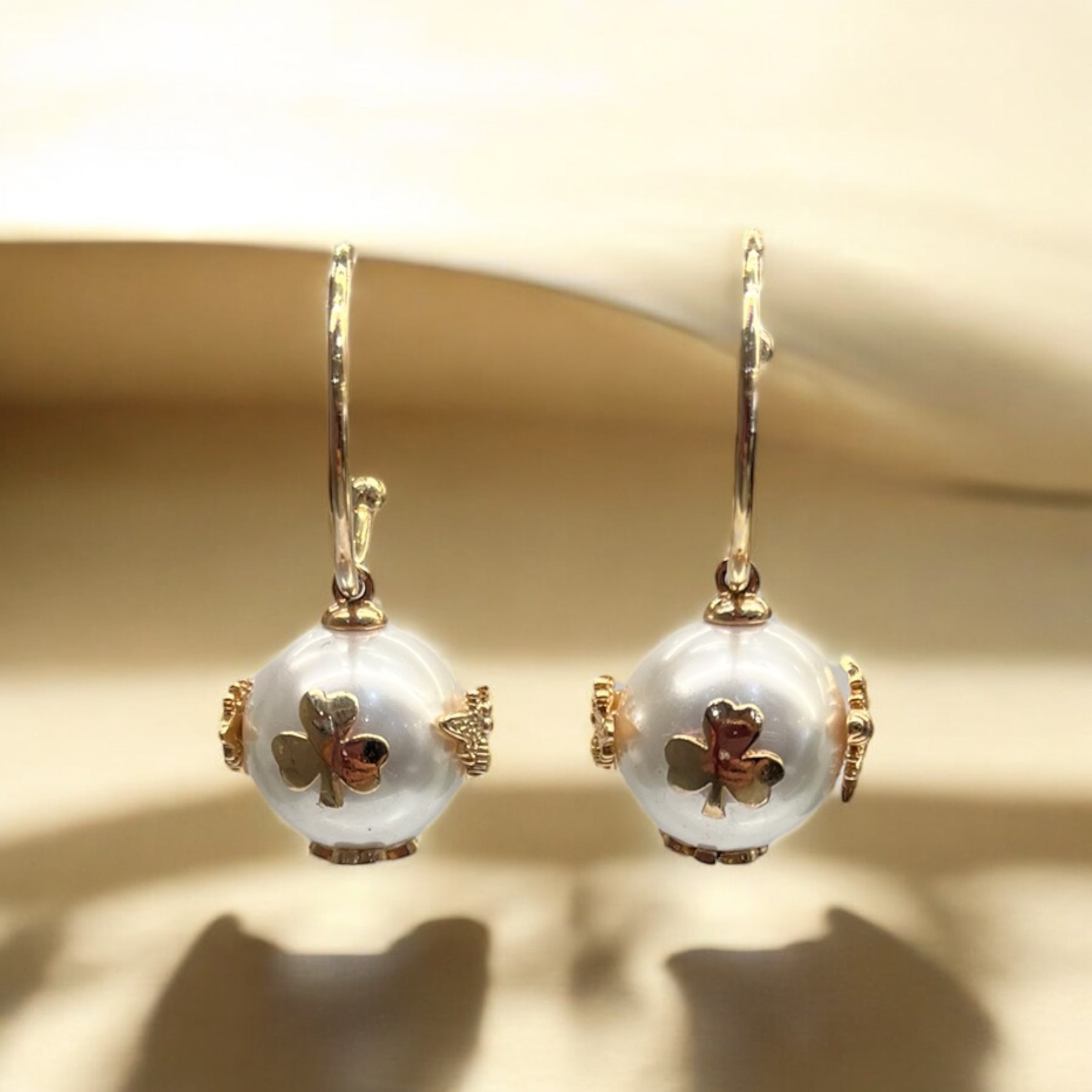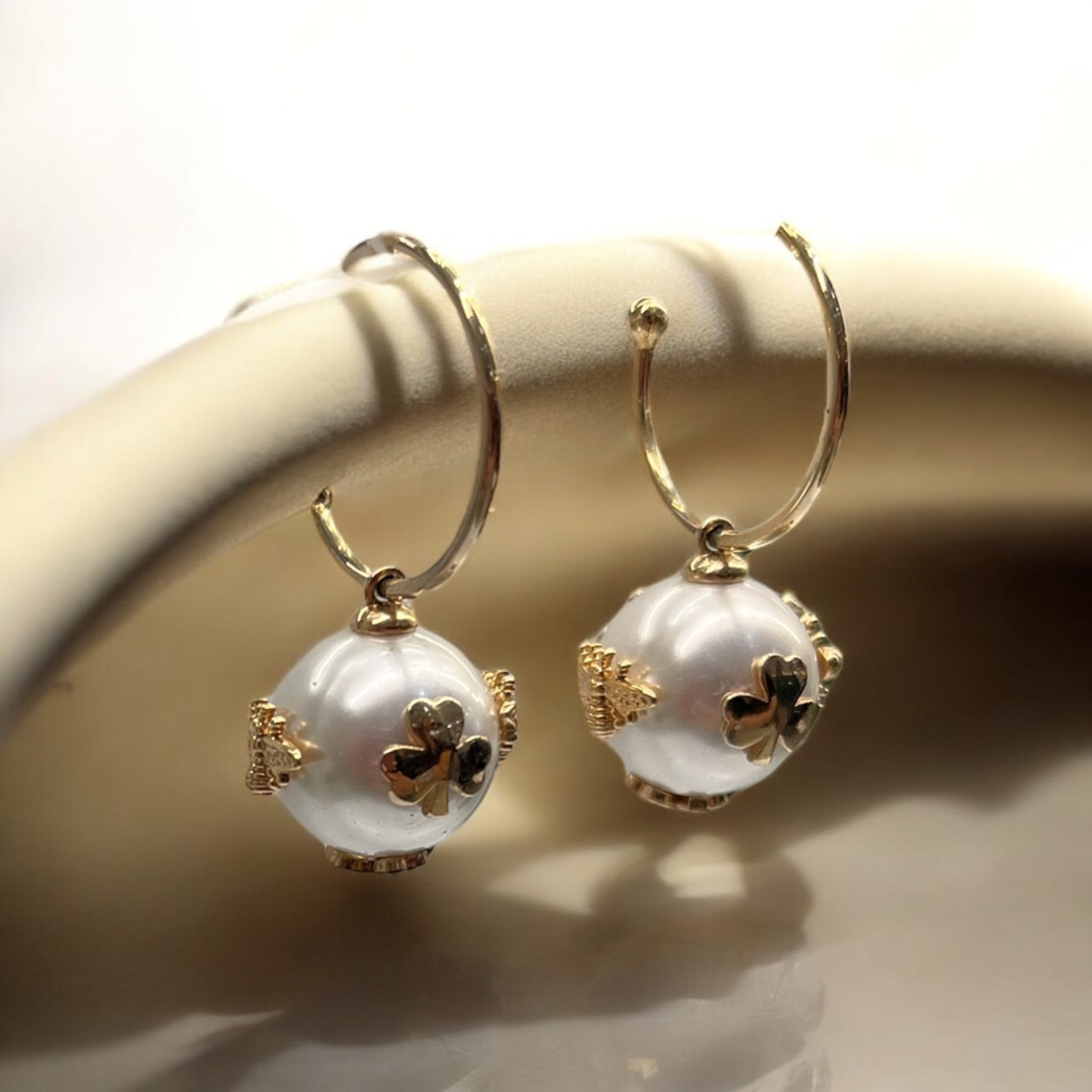 Brinco Argola com Pingente Pérola com Abelhas e Trevos