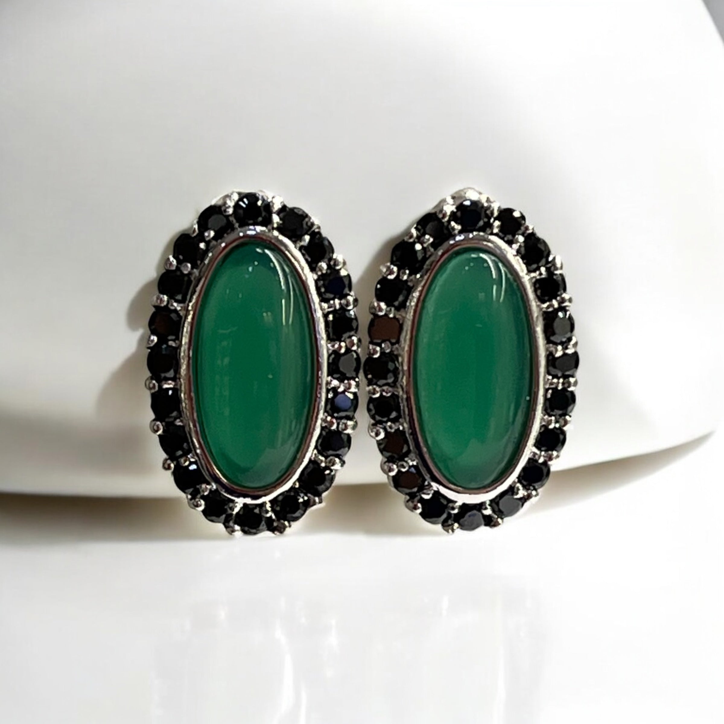 Brinco Oval Pedra Verde com Zircônias Negras ao Redor